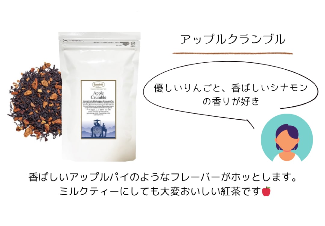 紅茶にリンゴ、トフィー、シナモンの風味を加えたフレーバーティ...